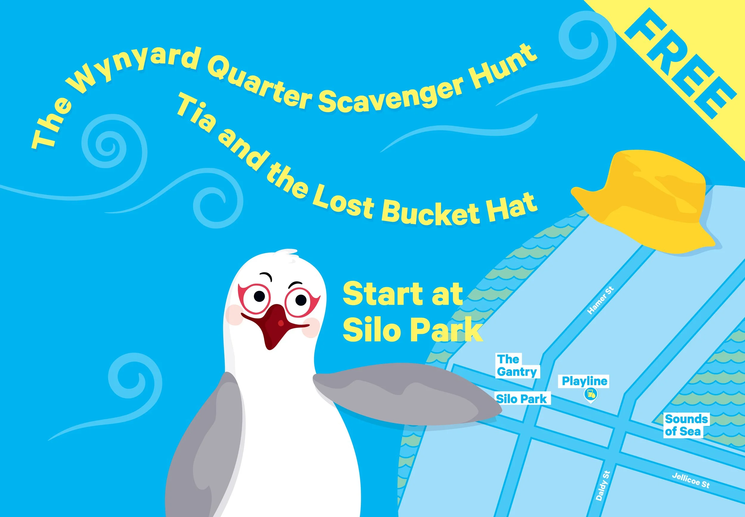 This story-based activity will take you on a one and a half kilometre journey around the Waterfront where you will meet new animal friends, solve puzzles, and reunite our heroine with her most prized possession - her yellow bucket hat! Simply scan the white audio QR chapter codes at each site to unlock the next section of the story, then solve the associated task or puzzle to reveal the next location! If at any time you feel tired, feel free to stop, take a break, get a snack, and Tia will be waiting for you at the location that you left her. The scavenger hunt starts at Silo Park.